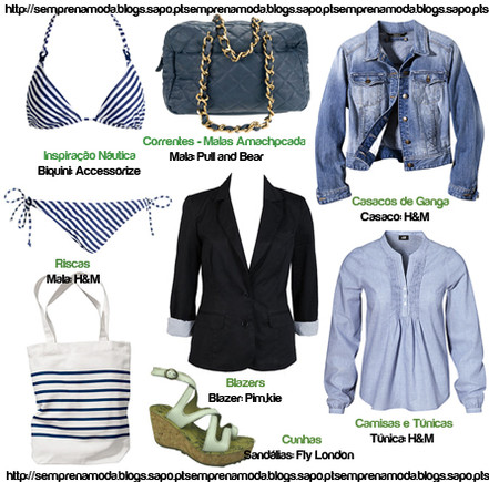 As riscas e o padrão náutico, fazem-nos muito lembrar o Verão e por isso é uma tendência perfeita para esta estação. As malas com correntes ou com um aspecto amachucado vão ser muito vistas. Os blazers voltam as estar na moda, gostei muito deste por ter mangas 3/4 e ter o pormenor na manga, que parece que tem uma camisa por baixo. As cunhas são super confortáveis e por isso nada melhor do que uns sapatos da marca Fly London. Como já disse a ganga está em todo o lado, os casacos de ganga são óptimos para as noites frescas de Verão. As camisas e túnicas são tão frescas que quase toda a gente adora usá-las quando o temperatura aquece.