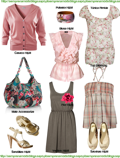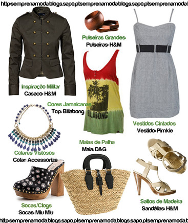 Muitas peças de roupa têm uma inspiração militar, sobretudo os casacos como o que mostro na imagem. As pulseiras grandes ou os braços com várias pulseiras estão muito na moda. As cores de Jamaica são tendência, e a Billabong usou-as em várias peças da sua colecção. Os vestidos cintados têm dado que falar, este é numa versão mais noite, mas para o dia-a-dia também tens vários à escolha. Os colares vistosos são indispensáveis! Também para a praia, este saco de palha será óptimo. Os saltos em madeira estão num enorme número de sapatos, não só e sandálias, mas também noutros géneros de sapatos. Agora as socas (clogs em inglês) estão muito na moda desde que a Chanel lançou as suas, ainda poucas lojas (baratas) têm, mas penso que brevemente vão poder encontrar nas fast fashion!