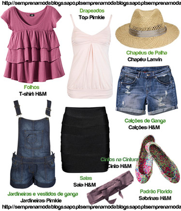 Os folhos e drapeados vão ser muito vistos em vestidos, tops e t-shirts. O chapéu de palha, perfeito para uma ida à praia, está novamente na ribalta. O regresso das jardineiras tem dado que falar, assim como os vestidos de ganga e jumpsuits. As saias estão também muito na moda, as de cintura alta são o must! O padrão florido para além de estar na roupa, pode ver-se agora em calçado, como é o caso destas amorosas sabrinas. No que diz respeito aos calções de ganga, usam-se tanto numa versão curta, como no estilo boyfriend. Para usar com vestidos ou mesmo com camisas, os cintos, que podemos encontrar sobretudo com uma largura média.