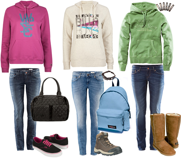 Sweatshirt rosa da Wesc; Sweatshirt com várias cores da Billabong; Sweatshirt verde da H&M; Ténis da Vans; Botas de montanha da Timberland; botas da UGG; Calças de ganga da H&M; mochila da Eastpak; mala da Hurley (?); Pulseira e genchos da H&M