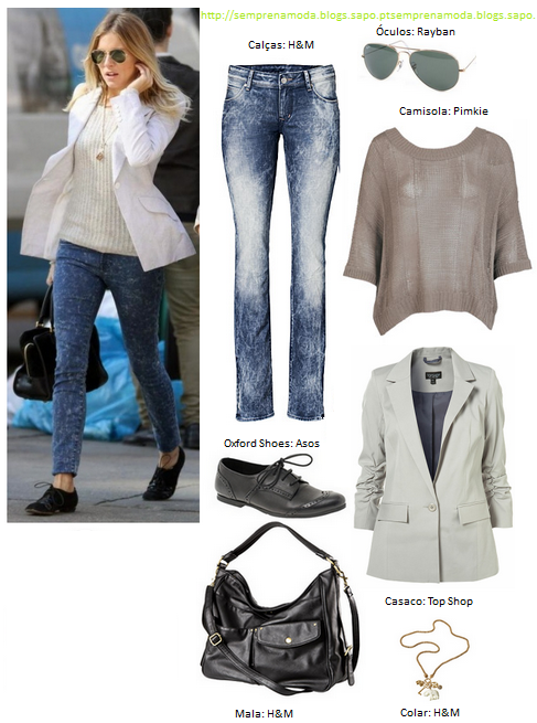 A Siena Miller tem um look preferencialmente boémio, no entanto nesta imagem vimos uma mistura do boémio com um look mais moderno. É uma sugestão ideal para os dias como os que estiveram durante o fim desta semana, com sol e frio de manhã. As calças desbotadas estão bastante na moda, assim como os blazers, este é branco, assim dá uma sensação maior de bom tempo, por baixo tem uma camisola um pouco quente, com um colar dourado e uns óculos rayban, usa uma mala simples preta.