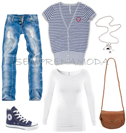 Para dizer a verdade acho que este look ficou muito giro e mesmo sendo um pouco mais elaborado não deixa de ser adequado para uma rapariga que ande no 7º ano. O casaco tem risquinhas, é de manga curta e tem um elástico que aperta em baixo, podes usá-lo com uma camisola azul escura, cinzenta, branca, escolhi a branca para dar um pouco mais de vida. Os jeans têm um efeito roto, o que os torna um pouco mais giros e ficam super bem com umas all star. A mala (que à primeira vista não tem nada a ver com o look) acaba por ficar a combinar muito bem, usei também um colar prateado.