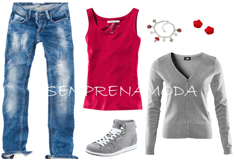 Este é um look bem simples e fácil de recriar, ideal para os dias em que o tempo para te arranjares é escasso ou quando estás com poucas ideias. A ideia deste look é dares um pouco de cor, já que os ténis e o casaco são cinzentos, a escolha do top pode ser colorida, como este top num tom framboesa. Quanto aos acessórios, são poucos mas bons, uma pulseira com alguns apliques divertidos e uns brincos pequeninos e colodos à orelha em forma de uma flor.