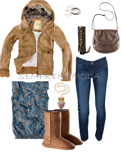 Aqui fica a outra sugestão. A minha escolha recaíu sobre uma túnica florida que aperta em baixo, mas que em cima tem um efeito mais largo. As calças são de ganga escura, fazendo algum contraste com o casaco de cabedal e as botas estilo UGG. Como brincos podes usar umas argolas e um colar também não ficará nada mal. A mala que escolhi é pequenina e prática, sendo perfeita para quando só tens uma ou outra coisa para levares, como a carteira, o telemóvel... Para os dias chuvosos nada melhor do que um guarda chuva pequeno e fashion!