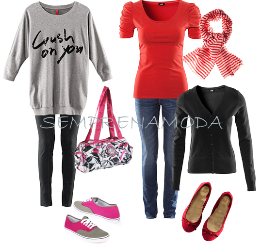 Já o segundo look é bastante diferente, tem mais um aspecto de menina mais certinha! Os jeans são de ganga escura e a t-shirt é vermelha com os ombros em destaque. É ideal para o início das aulas, enquanto não estiver muito frio, só para de manhã é que um cardigan é aconselhado. Para calçar usa umas sabrinas e como acessório o lenço é o suficiente.