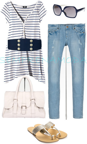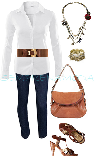 Aqui pensei em criar um visual mais jovem e fresco, pelo que optei por uma camisola de malha que, sendo simples e fina, fica bem com a delicadeza da saia. Podes optar por uns sapatos numa cor pastel, pois sendo comprida a saia pode eventualmente "encurtar-te" as pernas, mesmo sendo clara.