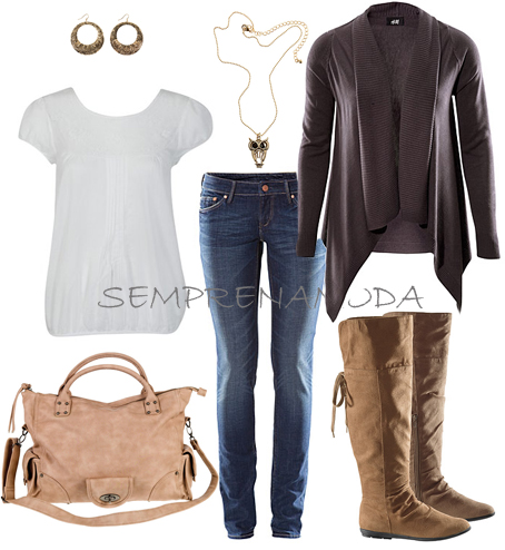 Para este look já escolhi umas calças, neste caso são de ganga escura e bastante simples, acho que com esta idade já não deves escolher calças rotas, com manchas e assim... A túnica é branca com uns bordados na zona do decote e podes usar um casaco castanho escuro. Para calçar umas botas camel e a mala num tom parecido, mas mesmo não sendo igual fica bem. Em relação à bijuteria pode ser em dourado.