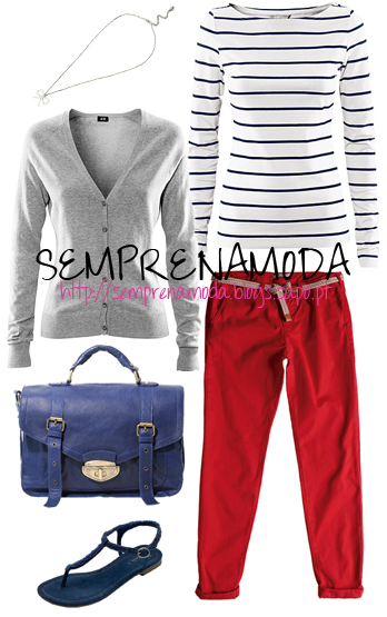Para quem gosta de looks com influência náutica, esta é a melhor escolha. A inspiração navy está presente nas cores (vermelho, azul e branco) e também é muito visível na camisola com riscas. Aqui, as calças vermelhas são conjugadas com uma camisola de riscas brancas e azuis e, para o caso de estar um pouco de vento ou mais fresquinho, um casaco de malha cinzento. Para calçar escolhi umas sandálias rasas azuis, que combinam com a mala. Achei que este look ficaria melhor com poucos acessórios e, por isso, coloquei apenas um colar.