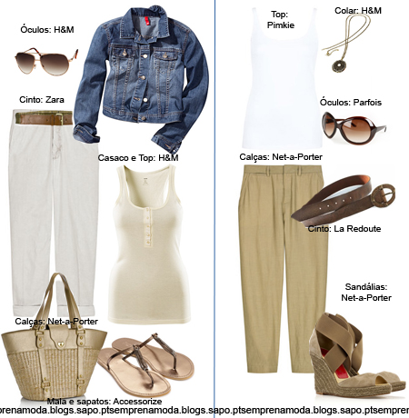 E, por último, fica o meu look preferido. Com as calças vermelhas coloquei uma túnica branca e um colete num tom toupeira que, por sinal, combina muito bem com a mala. Gosto muito de ver sabrinas com calças que tenham dobras e para este look escolhi umas sabrinas com risquinhas brancas e vermelhas. Juntem também um colar e uma pulseira, para completarem o look.