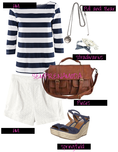 Confesso que quando vi estes calções fiquei deveras apaixonada!!! São lindos, tão soft, mas ao mesmo tempo não são uns calções brancos banais, pois os seus pormenores tornam-nos muito elegantes e ficam bem, tanto para um look descontraído, como para um look mais formal. A camisola escolhida é com padrão navy e pode ser usada por cima ou por baixo dos calções, conforme o vosso gosto. Para calçar escolhi umas sandálias de cunha azuis e completei o look com um colar e umas pulseiras.