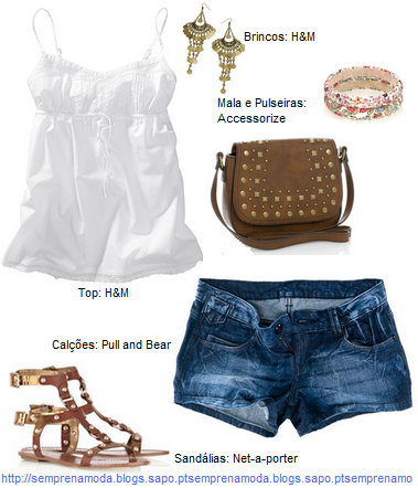 E agora fiquem com um look que eu fiz. Este look é bastante fácil de conseguir e podem recriá-lo certamente com peças do vosso guarda-roupa. Os calções são de ganga e bastante curtinhos e top é branco bastante simples. As sandálias são na minha opinião, lindas e combinam perfeitamente com os brincos e a mala. Para dar alguma originalidade ao look optei por umas pulseiras com flores, muito giras!