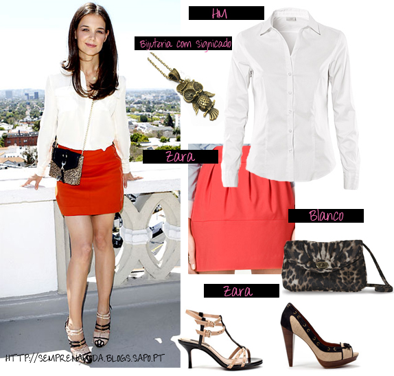 Hoje é recriado um look da Katie Holmes, look este que pode ser usado em diversas ocasiões, do dia-a-dia a ocasiões mais formais, por mulheres mais ou menos jovens. Este look é muito versátil e podem recríá-lo com outras cores, mudando, por exemplo, a cor da saia. A saia acaba mesmo por ser a peça que fica mais em destaque neste look, basta olhar para o look para percebermos que a saia é o que nos chama mais a atenção. A conjugação da saia vermelha com uma camisa branca resulta muito bem. Os sapatos não fazem muito o meu género e assim coloquei dois pares de sapatos que podem usar, nos mesmos tons, dependendo do vosso gosto. A mala usada é a tiracolo e com padrão tigresa, se não gostarem optem por uma mala preta, também a tiracolo. No que toca a acessórios este look é um pouco "pobre", por isso escolhi um colar para o completar.