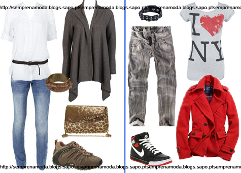 No segundo look temos umas baggy-jeans com uma t-shirt com letras e um casaco vermelho, bastante quente. Para calçar sugiro umas sapatilhas Nike pelo tornezelo.